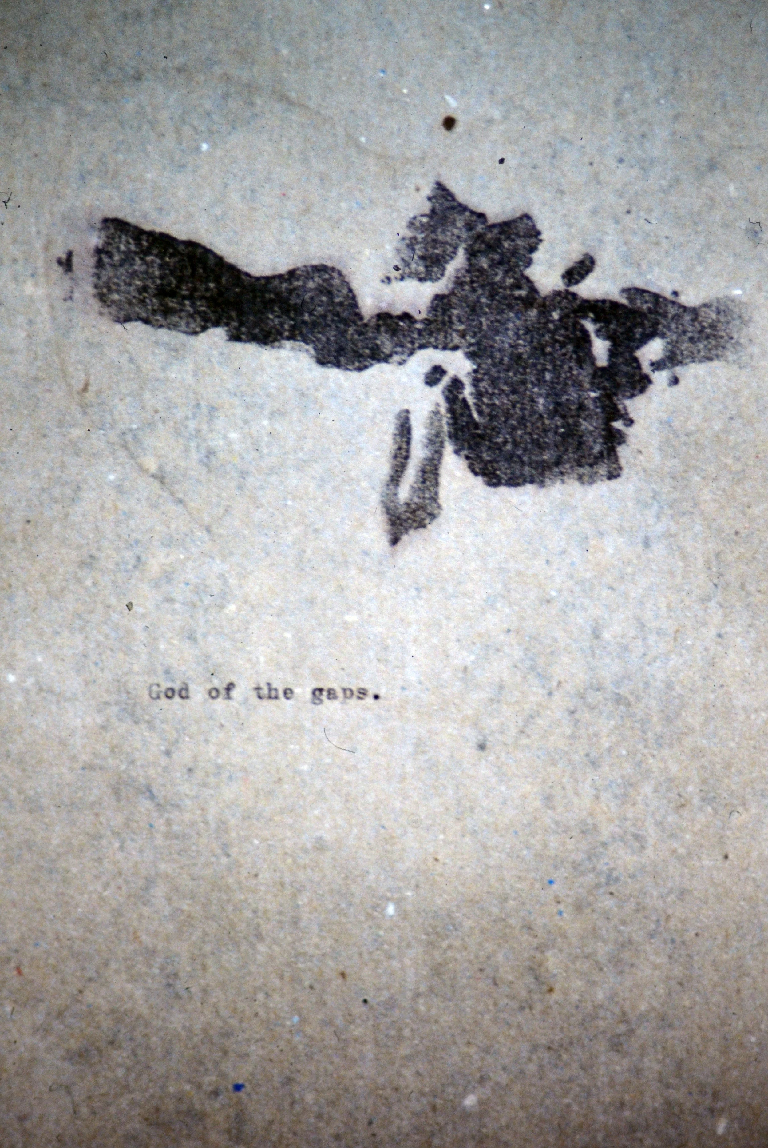 untitled (God of the gaps), 1996, oil pigment montotype and typewriter on paper, 4” x 9”